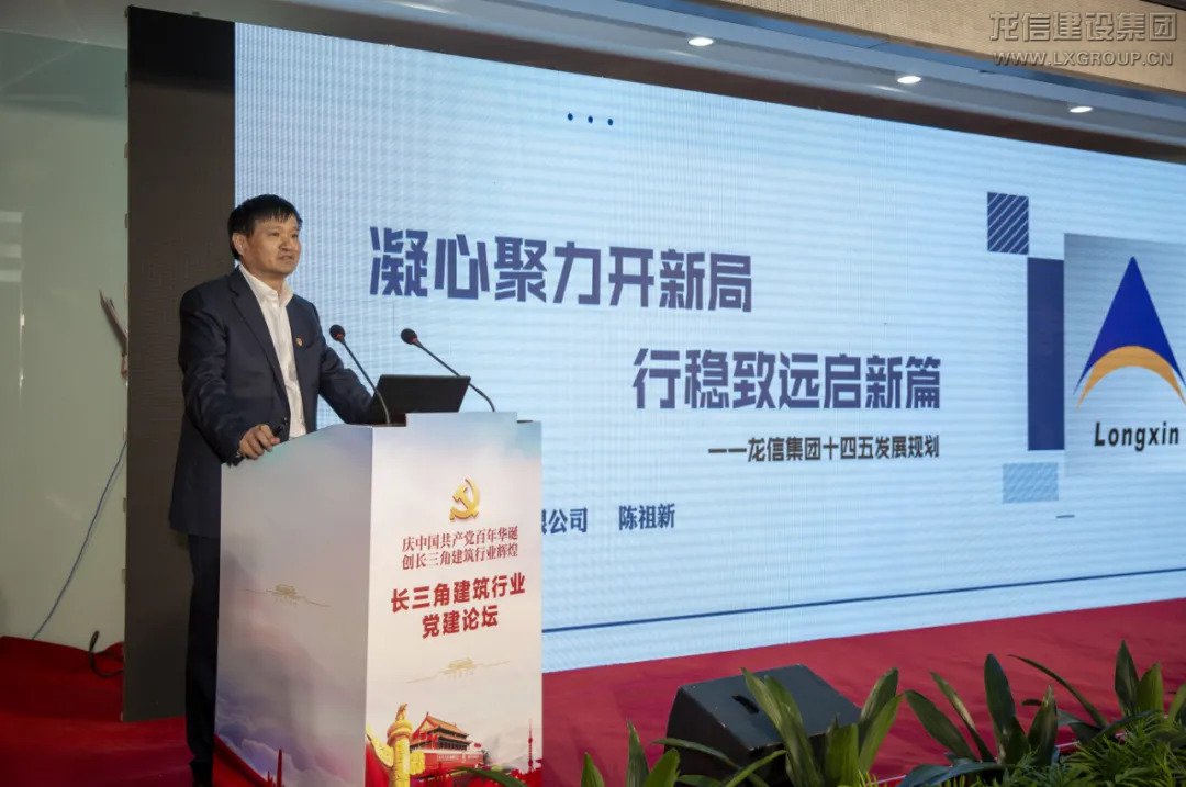會上,陳祖新以《奮斗百年路 邁進新時代 開拓新局面》為題,從建黨百年歷史回顧、黨建引領龍信發展以及開拓龍信新局面三方面展開交流發言。他說,龍信集團通過長期積累與探索,不斷完善黨的基層組織體系、黨建管理體系和運營考核體系,形成具有特色的《新時代龍信集團黨建工作法》,確保龍信集團的黨建工作與企業發展、生產經營、企業文化、群團工作、人才發展等各項建設深度融合。“十四五”期間,龍信將繼續緊隨國家發展步伐,聽從黨的指示,不忘初心、堅定不移地做一個有理想、有抱負、對社會負責任的企業,積極探索和發展綠色建筑、裝配式建筑、智慧建筑,努力成為新時代構建新發展格局,推動長三角建筑業高質量發展的生力軍。