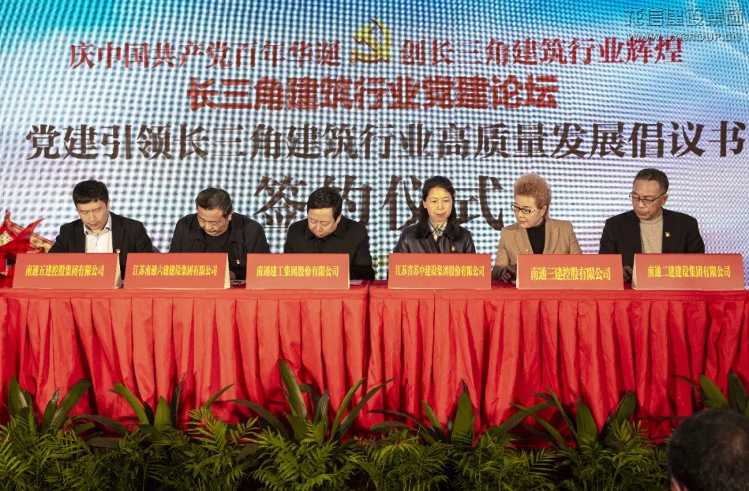 論壇上,長三角建筑行業黨建論壇揭牌,由安徽省建筑設計研究總院股份有限公司、沈陽建筑大學、中天建設集團有限公司、上海海怡建設(集團)有限公司、上海華東房產設計院有限公司、南通三建控股集團有限公司、江蘇省蘇中建設集團股份有限公司、南通建工集團股份有限公司、江蘇南通六建建設集團有限公司、南通五建控股集團有限公司、南通二建建設集團有限公司、龍信建設集團有限公司12家企業共同聯合發起《黨建引領長三角建筑行業高質量發展倡議書》。《倡議書》指出,長三角一體化的步伐鏗鏘有力、建筑業轉型升級高質量發展的藍圖已躍然紙上。未來,長三角區域里的建筑業企業,將堅持黨建引領企業發展,以踏實肯干的“老黃牛”精神、敬業奉獻的“孺子牛”精神、敢闖敢干的“初生牛犢”精神,朝著高質量發展的目標高歌猛進、再立新功,打好“十四五”之戰!