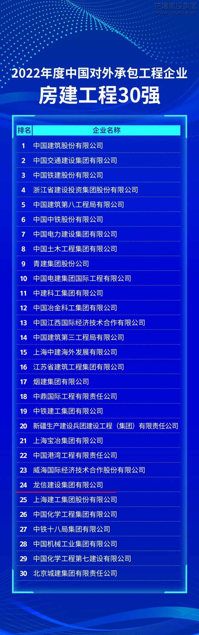 龍信建設集團榮登2022年度中國對外承包工程企業100強及房建工程30強榜單