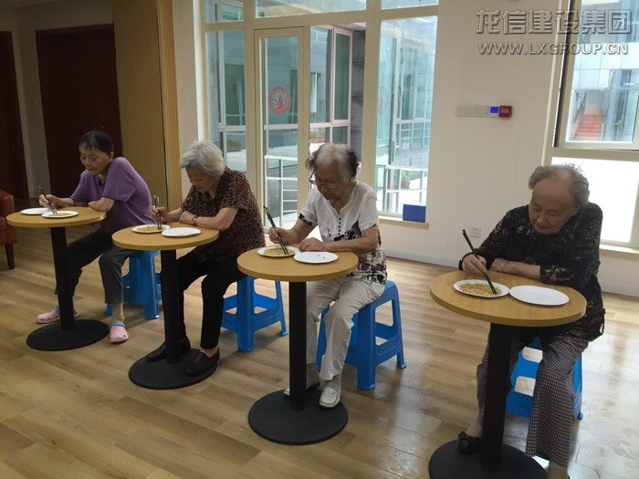 圖為叔叔阿姨正在進(jìn)行筷子夾黃豆比賽