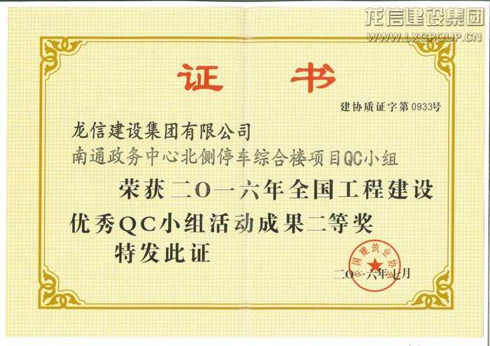 龍信集團的“龍信廣場QC小組”和“南通政務中心北側停車綜合樓項目QC小組”兩個企業優秀QC小組喜獲全國工程建設優秀QC小組二等獎。