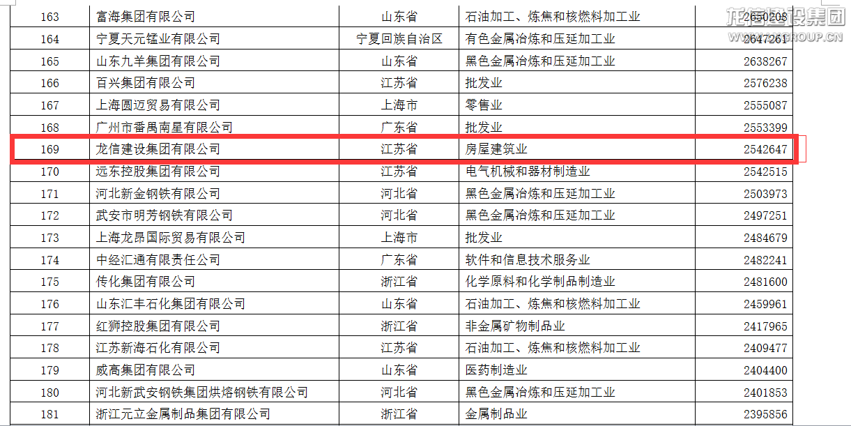 8月25日,由全國工商聯發布的“2015年中國民營企業500強”名單揭曉,龍信集團排名第169位,較2014年上升43位。